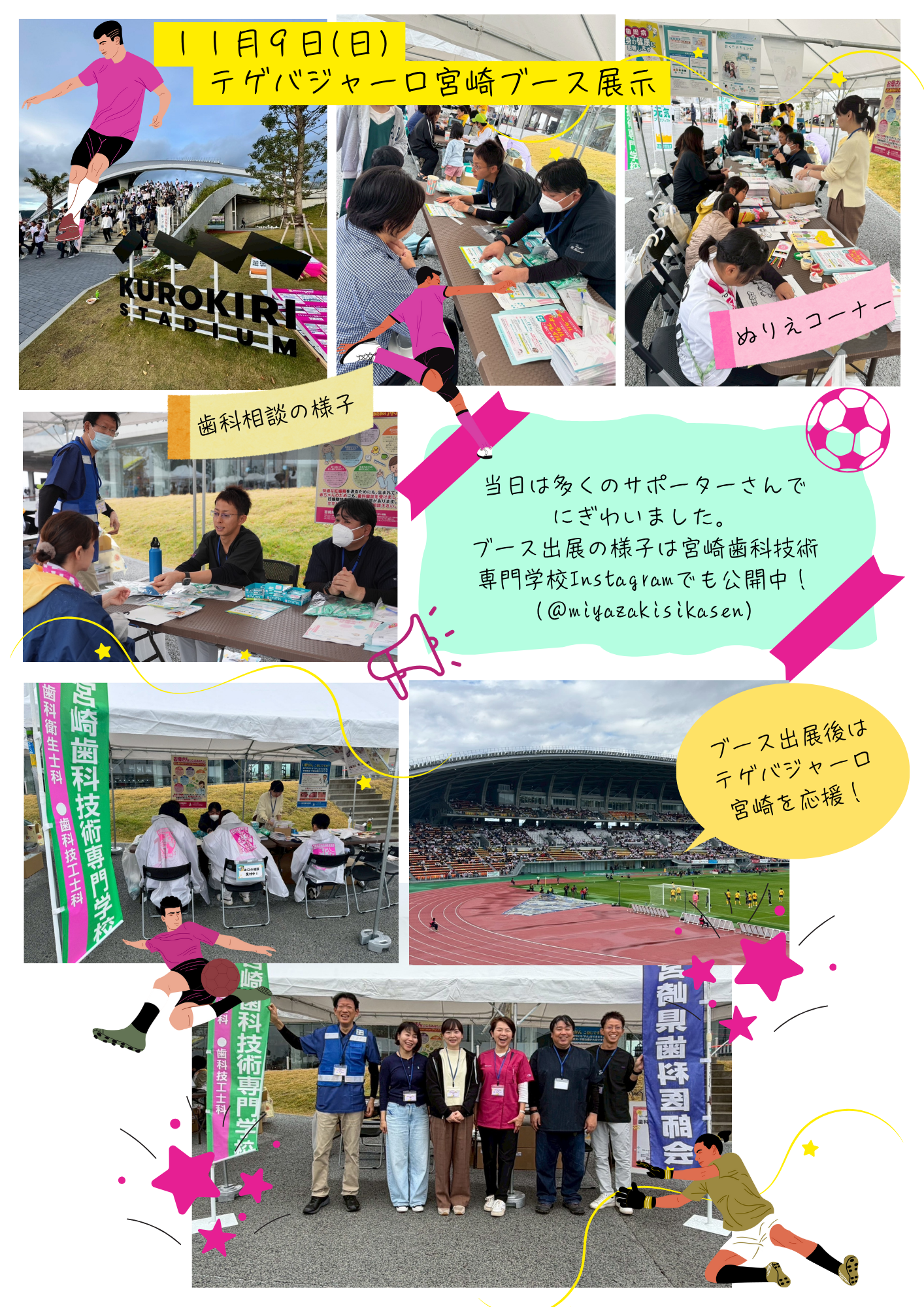 2025年11月9日(日)クロキリスタジアム(都城)での、テゲバジャーロ宮崎vsザスパ群馬の試合開催に伴い、宮崎県歯科医師会・宮崎歯科技術専門学校では、ブースを出展いたしました。小雨の降る天候にも関わらず試合開始4時間前から多くのブースは来場者で賑わい、お口の健康グッズ(歯ブラシ・フロス・Lotteキシリトールガム)は、多くの方に手に取っていただきました。テント内では、唾液の簡易検査を使っての歯科医師による「お口の相談会」を開催、赤ちゃんを抱っこしたお母さまからご年配の方まで多くの方が歯周病から矯正に至るまで、相談はつきなかったようです。
